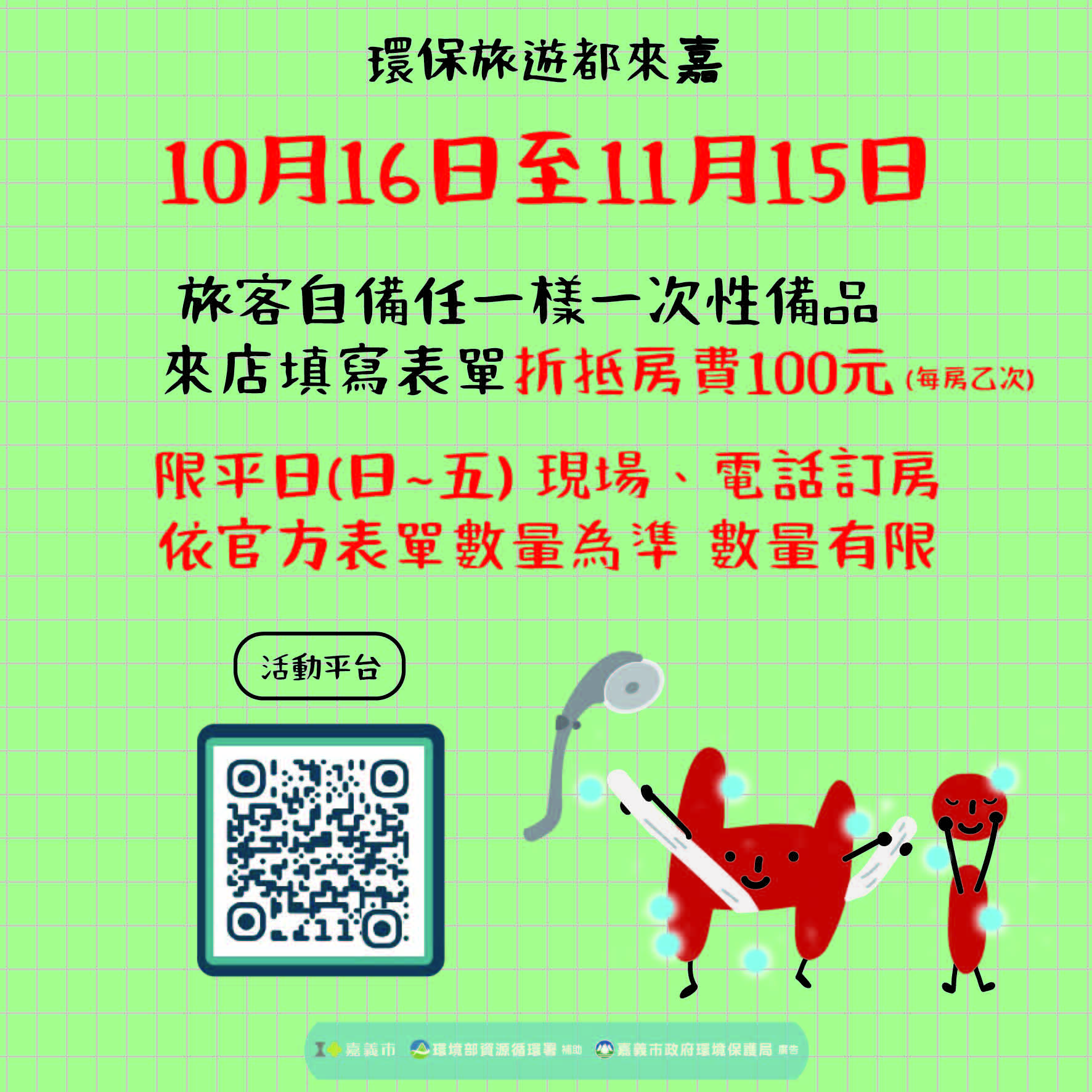 📍 凡旅客自備任一次性備品(如:牙刷、牙膏、刮鬍刀、梳子、浴帽等...),即可於入住時享有💰 100 元折扣優惠(每房乙次)