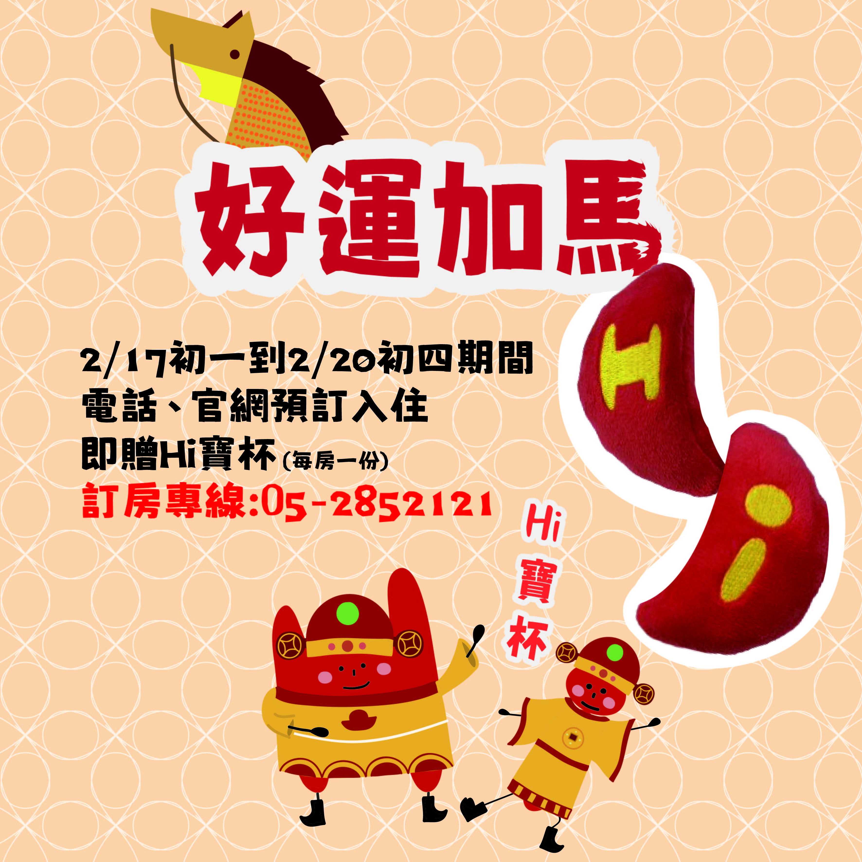 📅 2/17(初一)~2/20(初四) 📞 電話/官網預訂入住 🎁 每房贈「Hi 寶杯」乙份 讓祝福,延續到旅程之外。